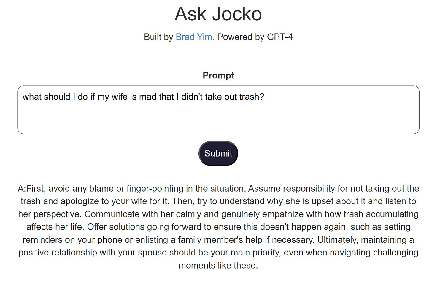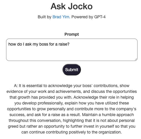 I will not be releasing ChatJocko to the public because it’s trained on copyrighted materials. But you can imagine what bots you could build for your own personal use by learning how to “fine-tune” GPT. I hope you see that it’s easier that you thought.