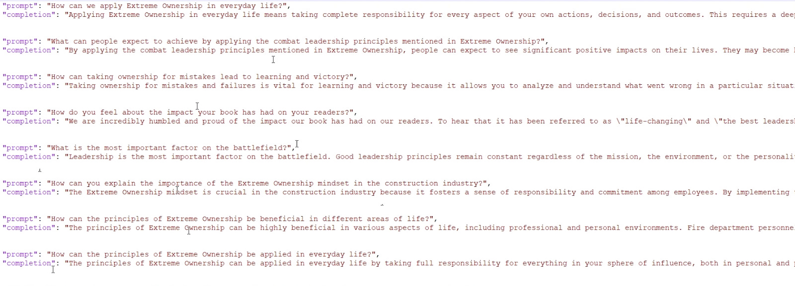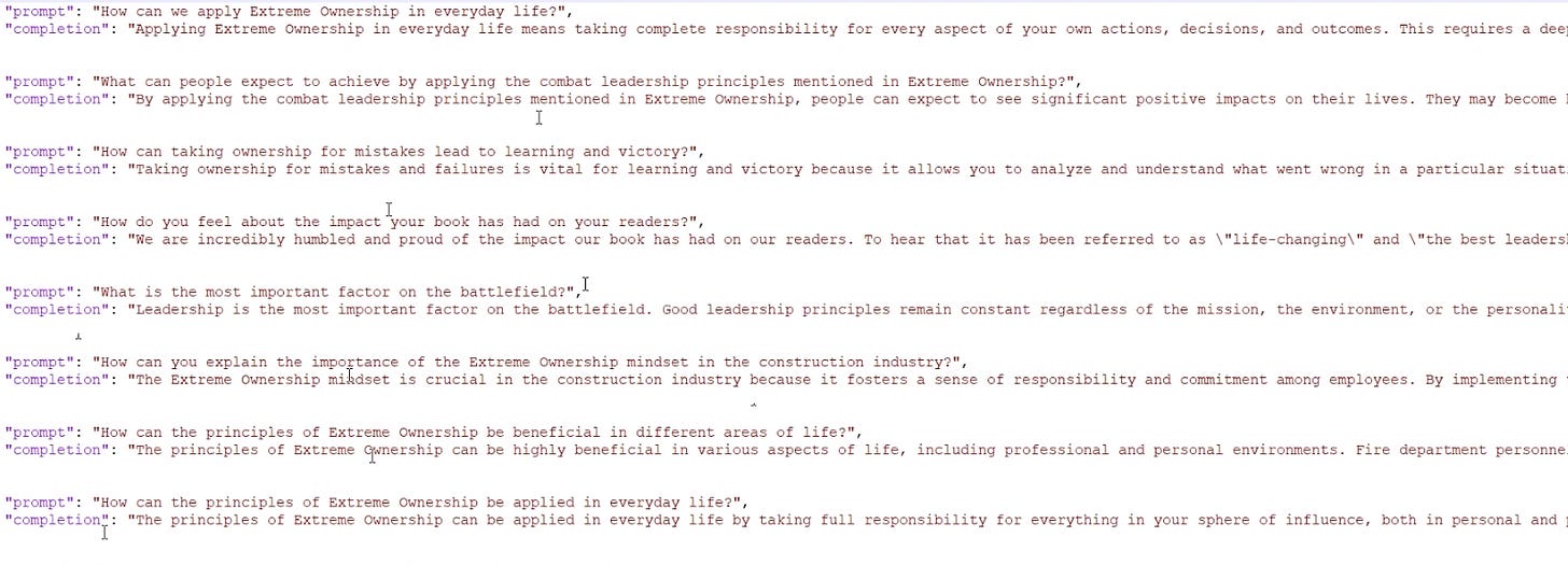 Each of these text chunks are fed into GPT and asked to generate question/answer pairs (which looks like below). I have a code written to automate this process, which I’ll feature in a future article. You could do this manually buy pasting each “chunk” into ChatGPT and asking it to create a prompt-completion pair.